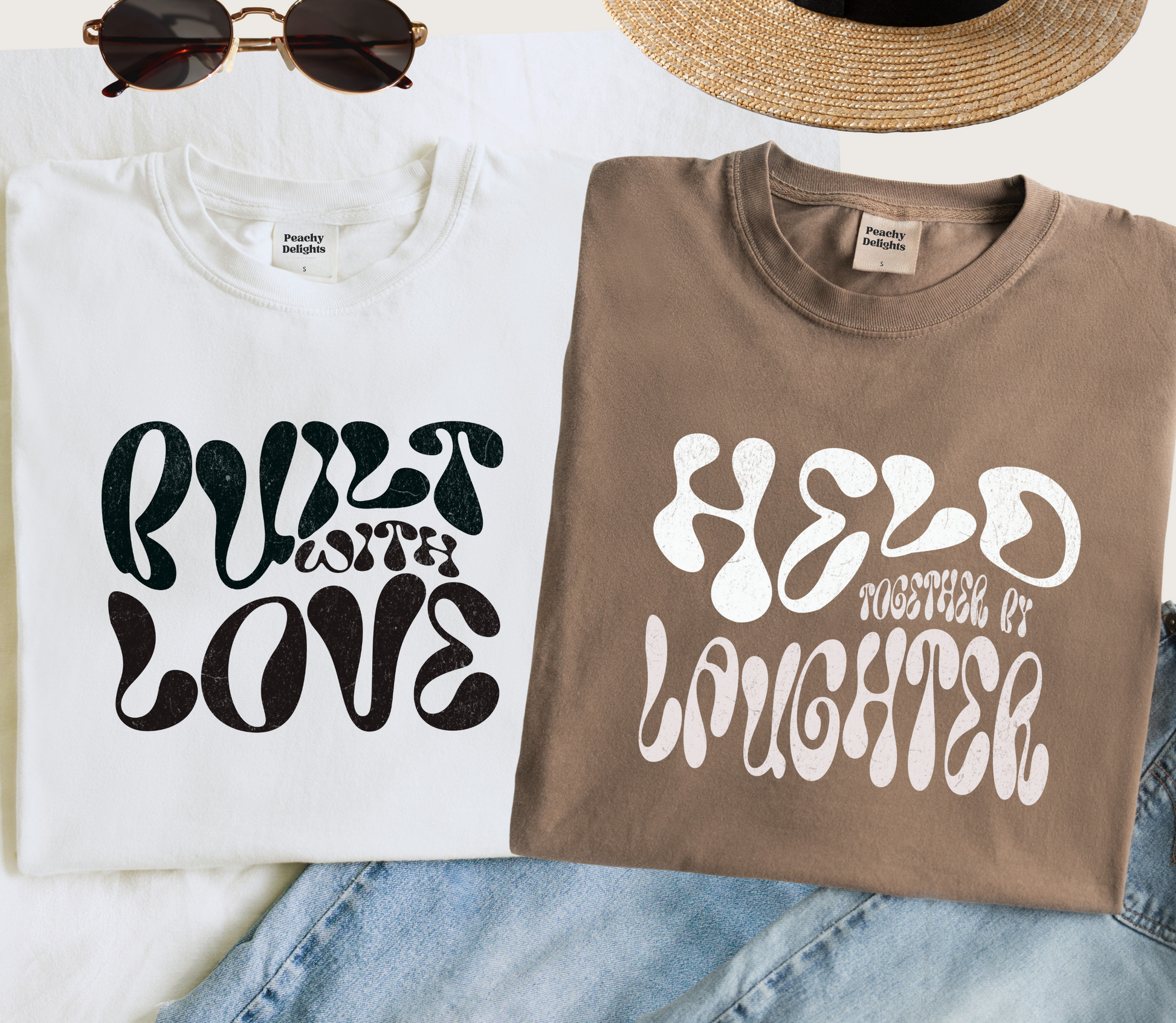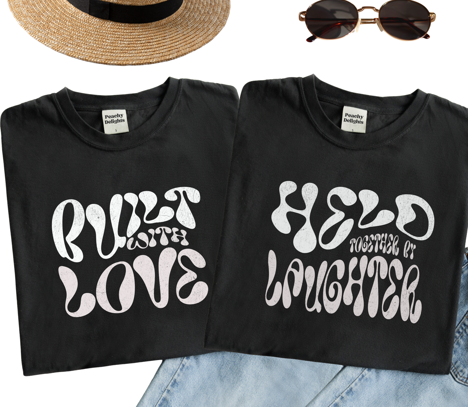 "Build with Love" and " Held Together By Laughter" Couple matching tshirt. Crafted from 100% premium cotton, these personalised couple matching T-shirts offer exceptional comfort and breathability. Available in a variety of colors, they can be customized to suit your style and relationship. Designed to provide a perfect fit and lasting durability, these tees make an ideal choice for couples wanting to express their connection with a personalized, stylish touch. Whether for special occasions or everyday wear, they combine quality and bespoke design effortlessly.